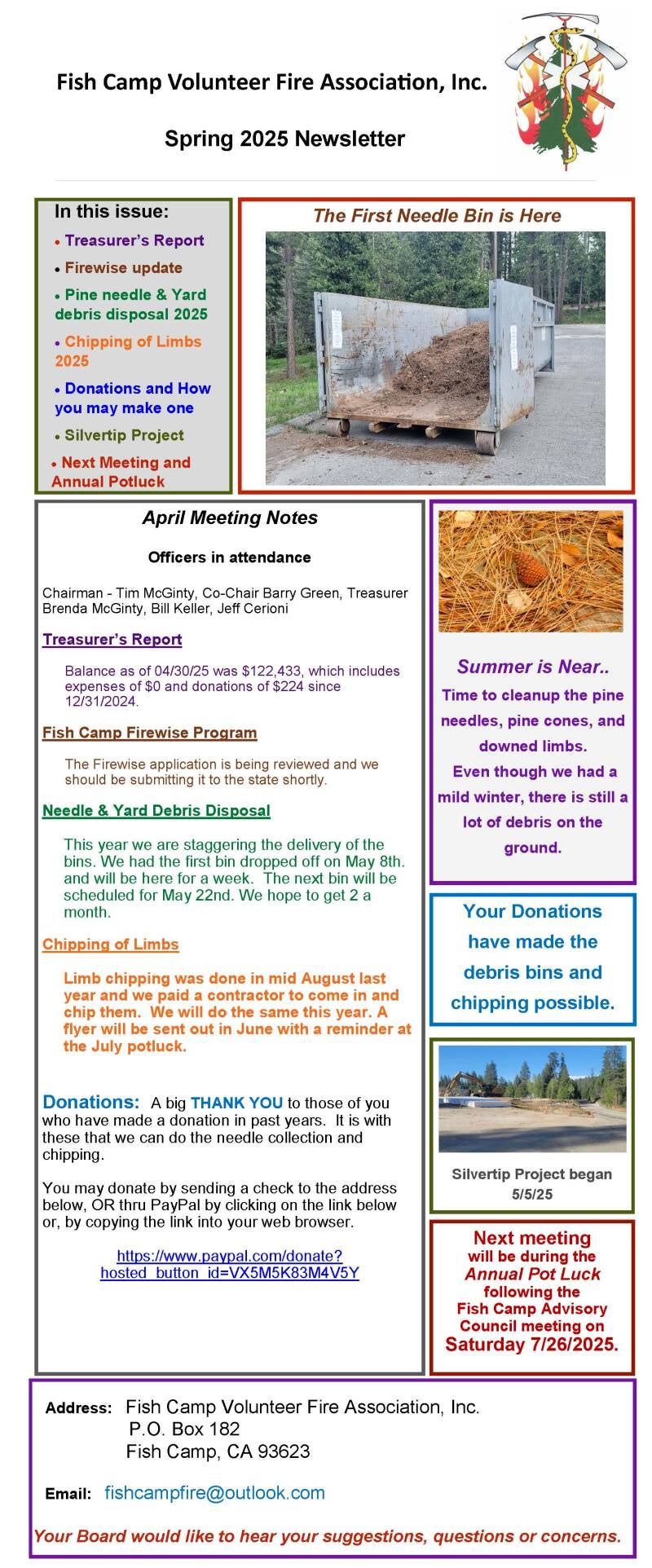 The specific purposes of this corporation are to serve the community of Fish Camp, California, by contributing financial resources and volunteer time to enhance fire protection services, educate in fire prevention and water conservation, aid the public water purveyors in the development and maintenance of additional water sources and storage, and generally support other measures to provide fire safety in the Fish Camp community.
